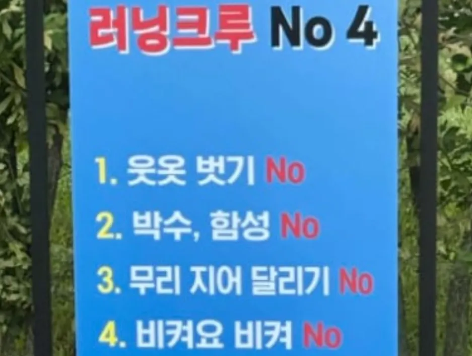 여의도공원에 세워진 ‘러닝 크루 No. 4’ 안내판에는 ▲윗옷 벗기 ▲박수·함성 ▲ 무리지어 달리기 ▲‘비켜요 비켜’ 등의 행위에 중지를 요하는 내용이 담겼다.