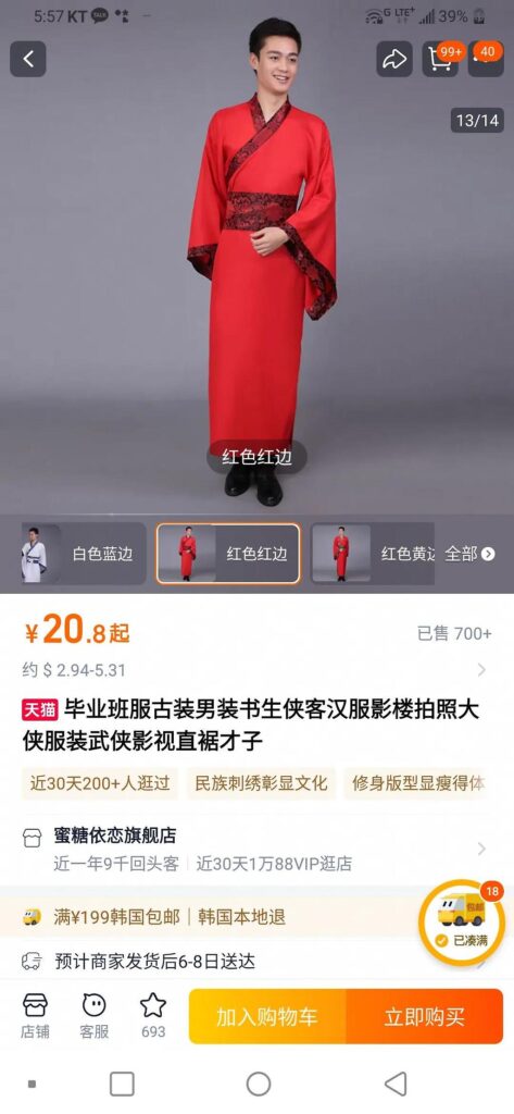 문제의 장면은 최근 SNS를 통해 확산됐다. 한복 브랜드 대표이자 문화유산 해설사로 알려진 한 누리꾼은 지난 11일 자신의 SNS에 “부여 백제문화제 패션쇼 영상을 보다가 아무리 봐도 이상해서 타오바오에서 찾아봤더니 똑같은 옷이 있었다”며 의혹을 제기했다.