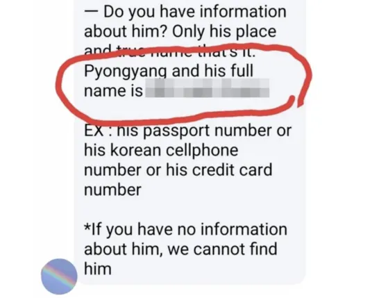 연락이 두절된 한 코피노 아버지는 자신의 거주지가 ‘평양’이라고 속인 것으로 알려졌다. 이 남성은 필리핀 어학연수 중 현지 여성과 사이에서 아이를 낳고 도망쳤는데, 자신의 거주지를 북한 평양이라고 밝혔다. 구씨는 여성이 보낸 도움 요청 메시지를 공개했다.